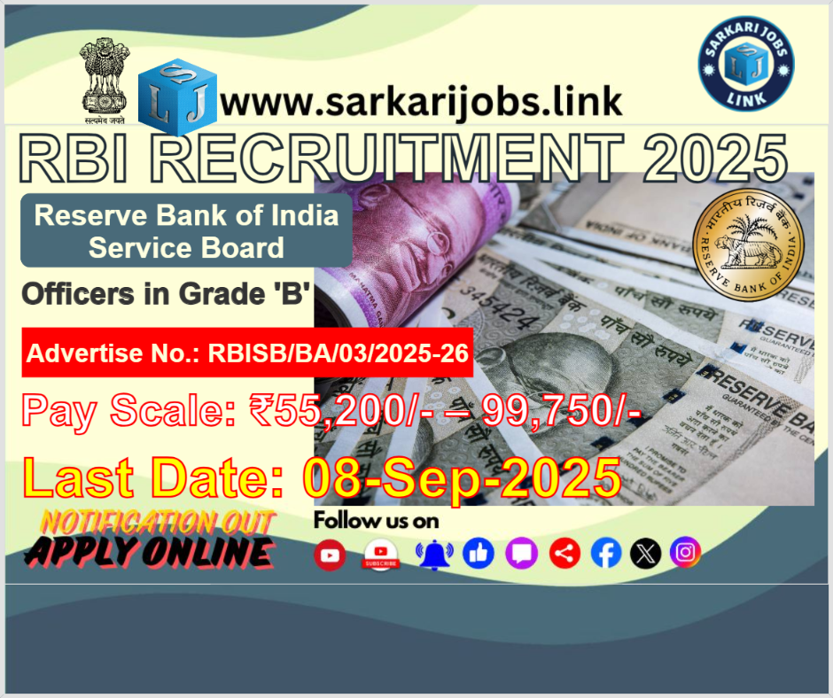Sarkari Jobs is posting the details of eligibility criteria, selection process, number of vacancies and the other important information of the RBI Recruitment 2025. Reserve Bank of India Service Board has published the notification to invite the eligible applicants to fill the online application through its official website for selection of Officers in Grade 'B'. Total number vacancies are 120 and interested eligible candidate may apply online from 10-09-2025 to 08-09-2025. Applicants are strongly recommended to read the notice before applying.