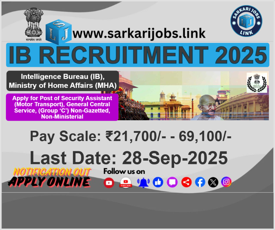 The Intelligence Bureau (IB), under the Ministry of Home Affairs (MHA), Government of India, has announced the IB Security Assistant (Motor Transport) Recruitment 2025, offering a golden opportunity for job seekers aiming to secure a prestigious government position. This recruitment drive is for the post of Security Assistant (Motor Transport), a non-gazetted, non-ministerial Group ‘C’ role that plays a critical part in the operational efficiency of the IB across various Subsidiary Intelligence Bureaux (SIBs) in India. With a total of 455 vacancies announced, this recruitment is a significant opportunity for candidates who have completed their 10th-grade education and possess a valid Light Motor Vehicle (LMV) driving license. The application window is open from 6 September 2025, to 28 September 2025, and candidates can apply online through the official MHA portal.