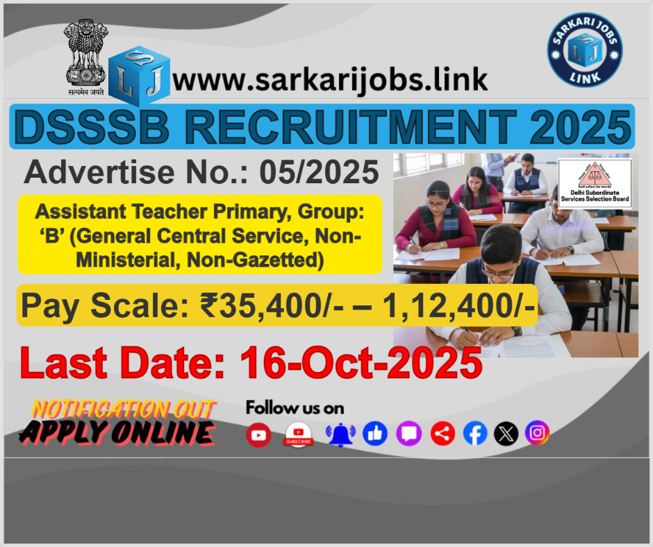 Sarkari Jobs is posting the details of eligibility criteria, selection process, number of vacancies and the other important information of the DSSSB Recruitment 2025. Delhi Subordinate Services Selection Board, GOVERNMENT OF NCT OF DELHI has published the notification to invite the eligible applicants to fill the online application through its official website for selection of Assistant Teacher Primary, Group. Total number vacancies are 1180 and interested eligible candidate may apply online from 17-09-2025 to 16-10-2025. Applicants are strongly recommended to read the notice before applying.